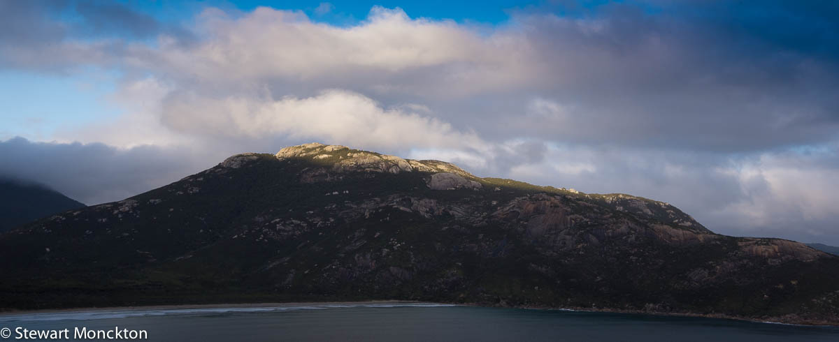 These two images show the hills at the south end of Norman Bay, taken from Tidal Overlook. They are just catching the last light of the day.