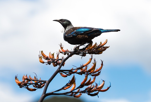 The Tui is one of the largest honeyeaters, and is a little bigger than most thrushes. Because of the white throat tufts, this bird is sometimes called The Parson Bird. In dull light they can look almost black, but when they catch the sunlight, their feathers taken on a metallic sheen.